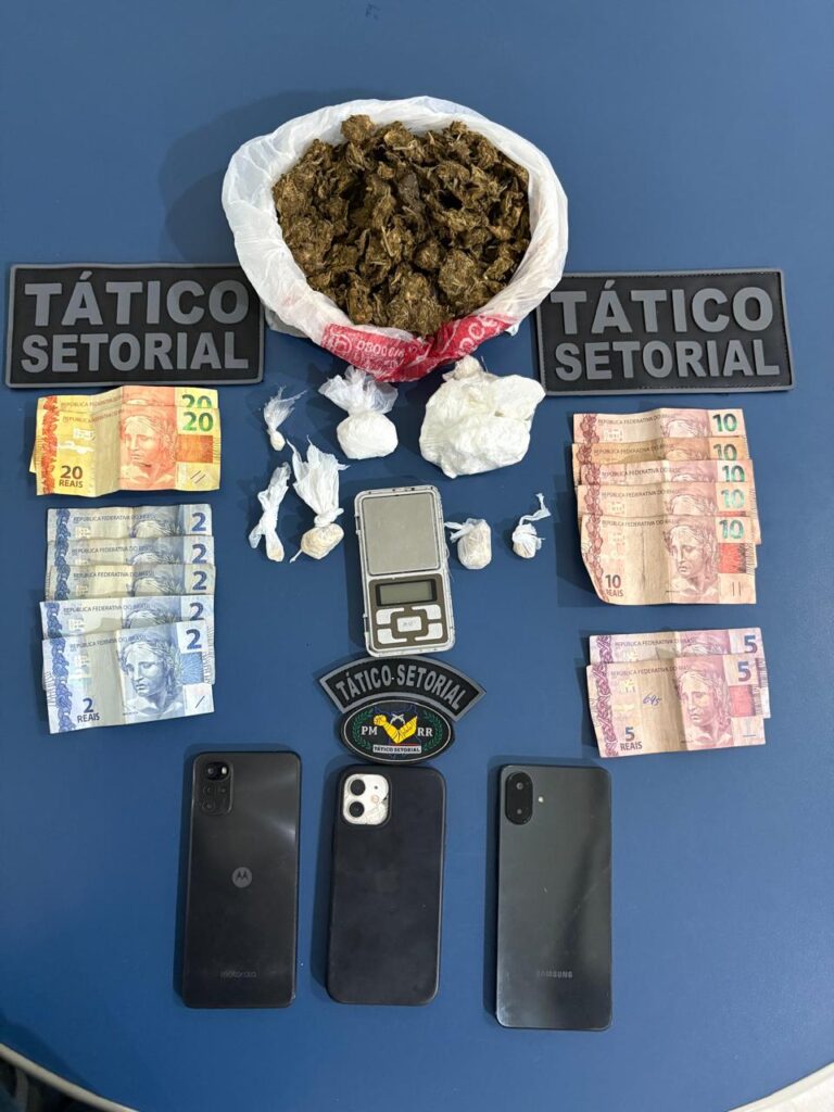 A Polícia Militar de Roraima apreendeu drogas, uma balança de precisão, celulares e dinheiro durante patrulhamento no bairro Nossa Senhora Aparecida, em Boa Vista, na noite de terça-feira (18). A ocorrência foi atendida pelo Tático Setorial do 1º Batalhão da Polícia Militar.