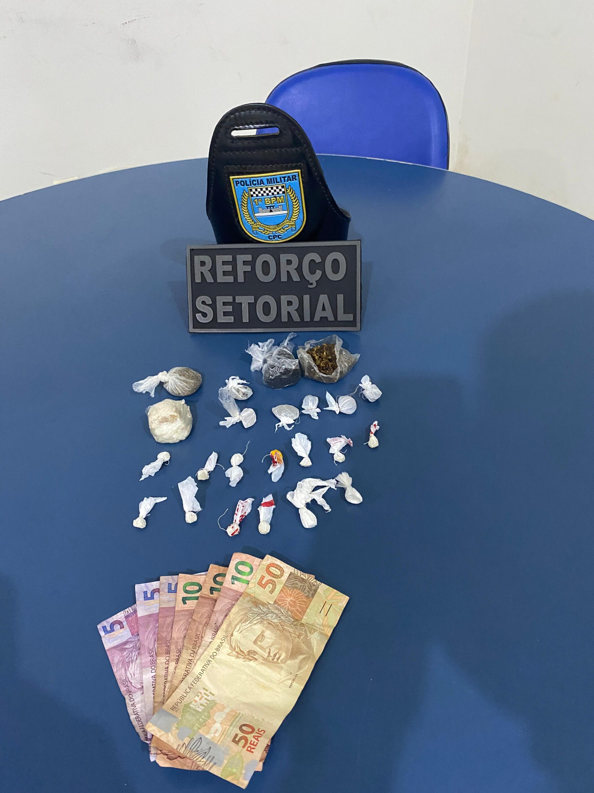 Com ele foram encontrados invólucros de crack e dinheiro em espécie. Já em seu apartamento, os policiais apreenderam porções de maconha e cocaína.