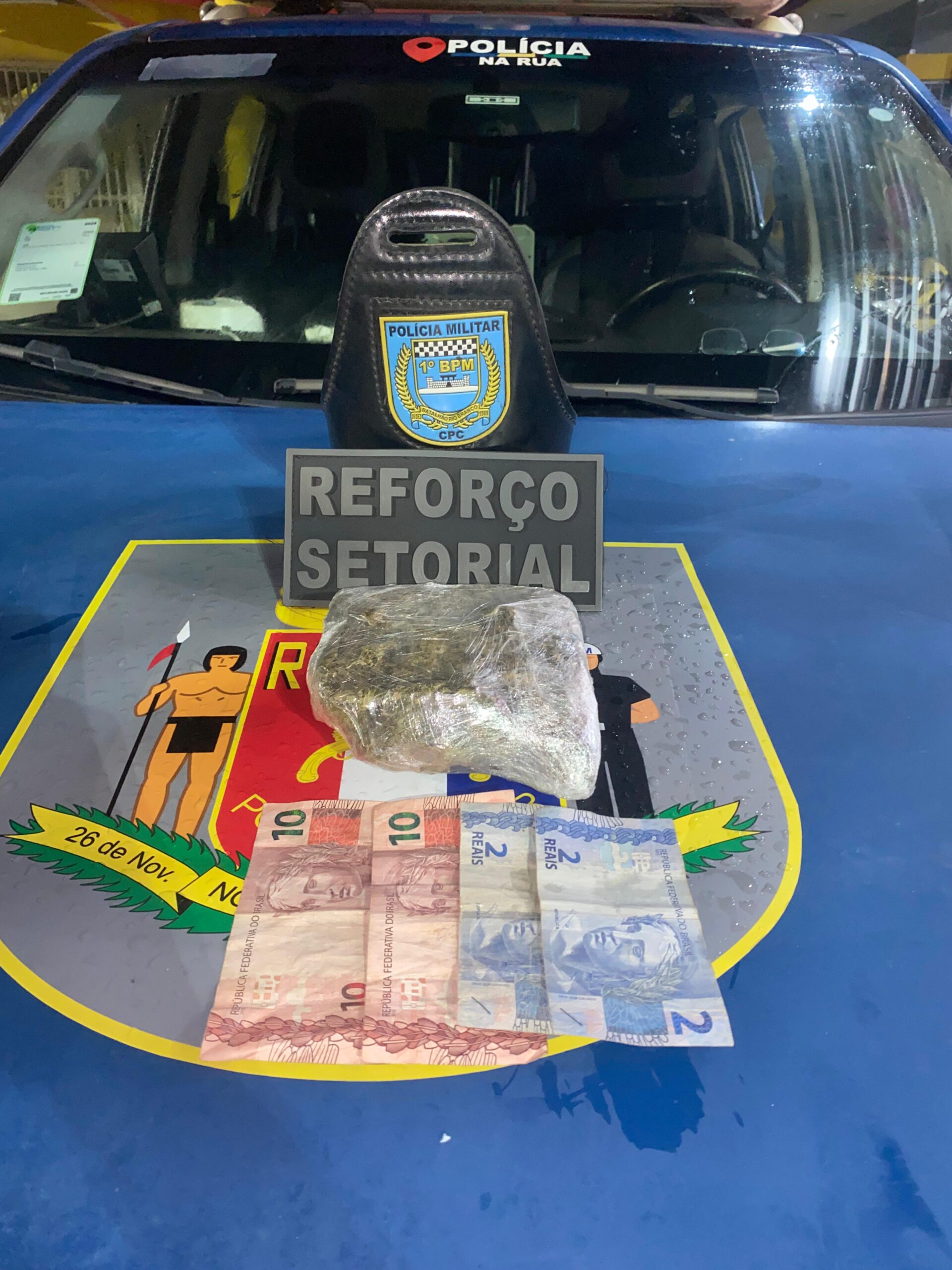 A equipe do tático setorial do 1º Batalhão da Polícia Militar prendeu um homem de 21 anos (G.S.M.) no bairro São Vicente, em Boa Vista, durante patrulhamento próximo a um estabelecimento comercial. O suspeito foi abordado e, em uma mochila de entrega de motoboy que ele carregava, foram encontrados um invólucro grande de substância análoga a skunk (maconha) e R$ 24 em espécie.